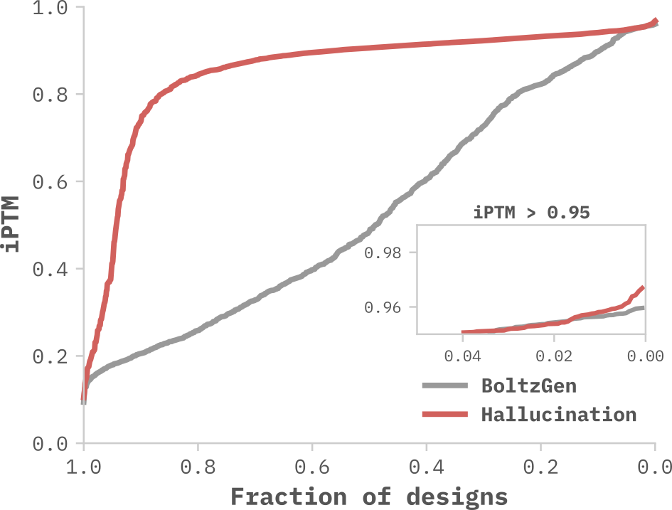 Hallucination means optimizing through a neural network (or combination of networks): keeping the network fixed, varying the input sequence to maximize (for instance) cofolding confidence and sequence recovery. This works quite well, but iterative optimization can be very expensive: generating a single design candidate might require 150 structure predictions. Generative models like BoltzGen produce candidates in a single forward pass; thus, they're typically much faster per design. That's great! Unfortunately, however, the per-design in silico success rates of generative models are currently much lower than those of hallucination-based methods .