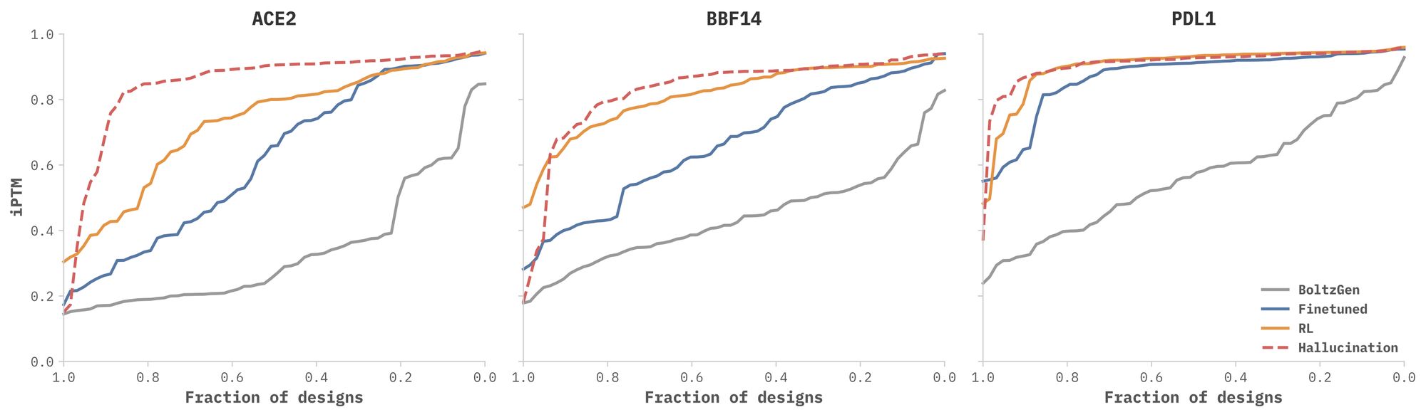 - Honestly, this feels a bit circular: we're using three models (BoltzGen, Protenix, and ProteinMPNN) that all trained on the same dataset (PDB) to generate, evaluate, and provide feedback on the same set of hallucinated designs. Do we need to do this? Would better low temperature sampling be enough?