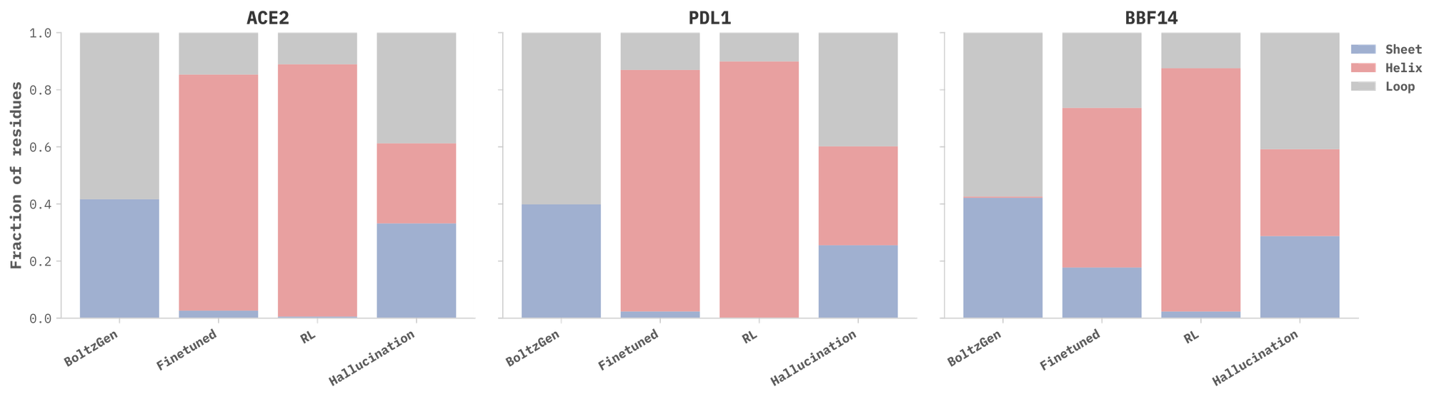 The base BoltzGen model produces very low diversity sequences for PDL1 at this sequence length. Oddly, the model finetuned on the hallucinated structures produces far fewer beta sheets than occur in the hallucinated structures themselves.